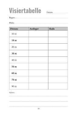 Datum: Bogen: Pfeile: Distanz Ausleger Skala 10 m 18 m 20 m 30 m 40 m 50 m 60 m 70 m 90 m Notizen: 10